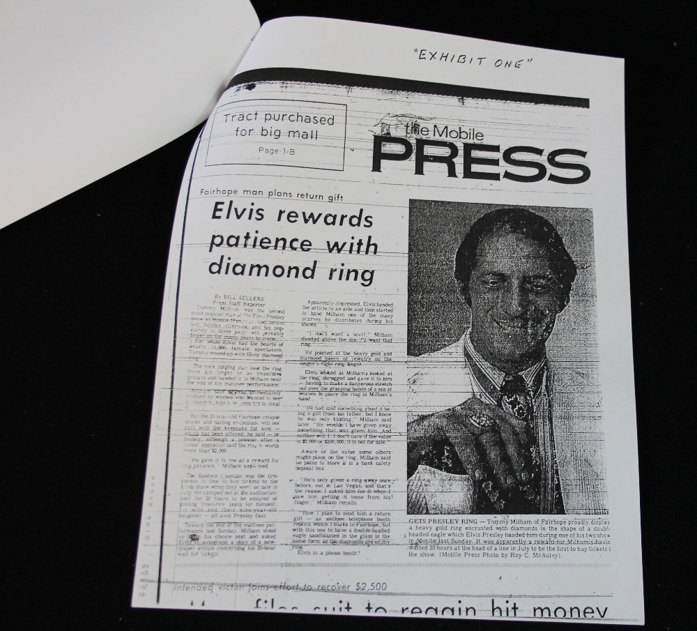 В 1976 году Элвис подарил его одному фанату Томми Милхэму, который пристал к нему с просьбой перед телекамерами. Пресли сначала хотел отдариться шарфом, но фанат оказался жутко настойчивым, шарф не взял, настаивал на перстне и в итоге получил его от щедрого Короля.