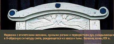 Фараонка держит в правой руке открытую книгу, левая же рука фараонки вместе с деталями растительного орнамента складывается в нечто весьма напоминающее крест анх.