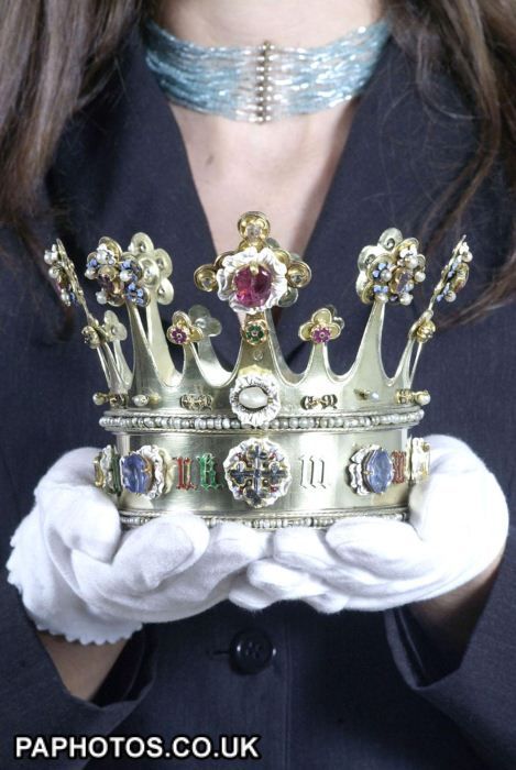 Каркас короны в настоящее время завершен. Он изготовлен из недрагоценных металлов.В ближайшие недели он будет полирован, с покрытием из золота, и, наконец, украшен эмалированными белыми розами, гранатами, сапфирами и жемчугом. Идею поставить белые розы на корону мы почерпнули из сохранившейся короны сестры Ричарда - Маргариты, герцогини Бургундии. Эта небольшая, очень женственная корона, сохранилось в сокровищнице собора в Аахене, потому что она ее пожертвовала к образу Пресвятой Богородицы".