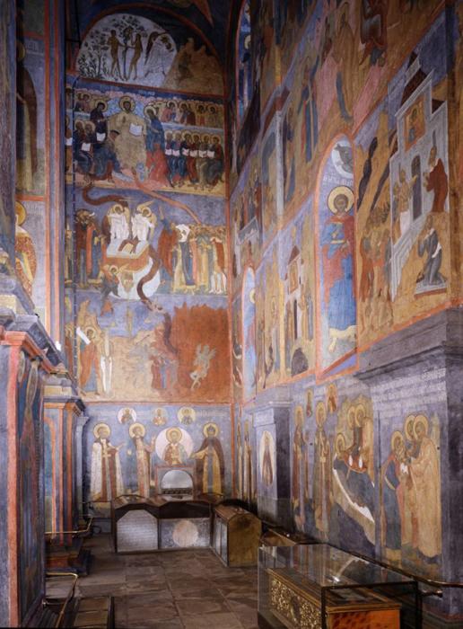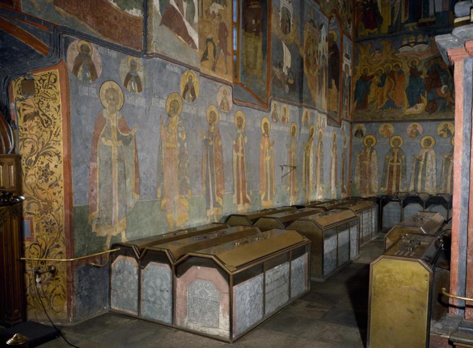Написаны князья на стенах собора, над своими каменными надгробиями. В медальонах - их святые покровители.